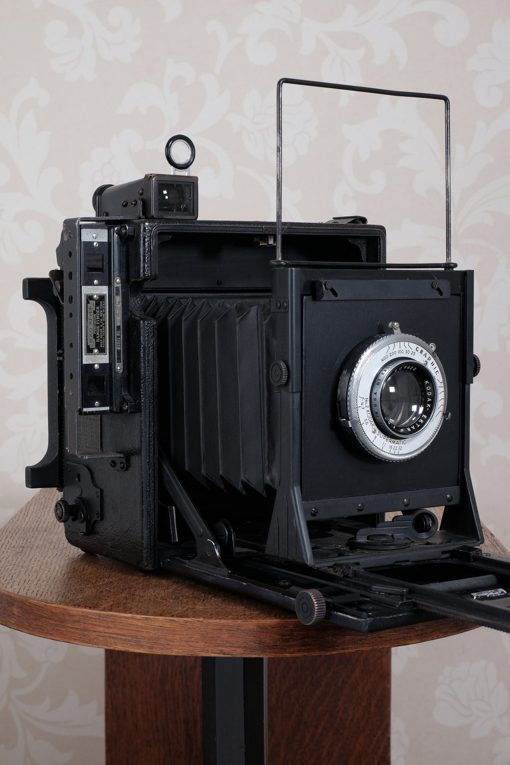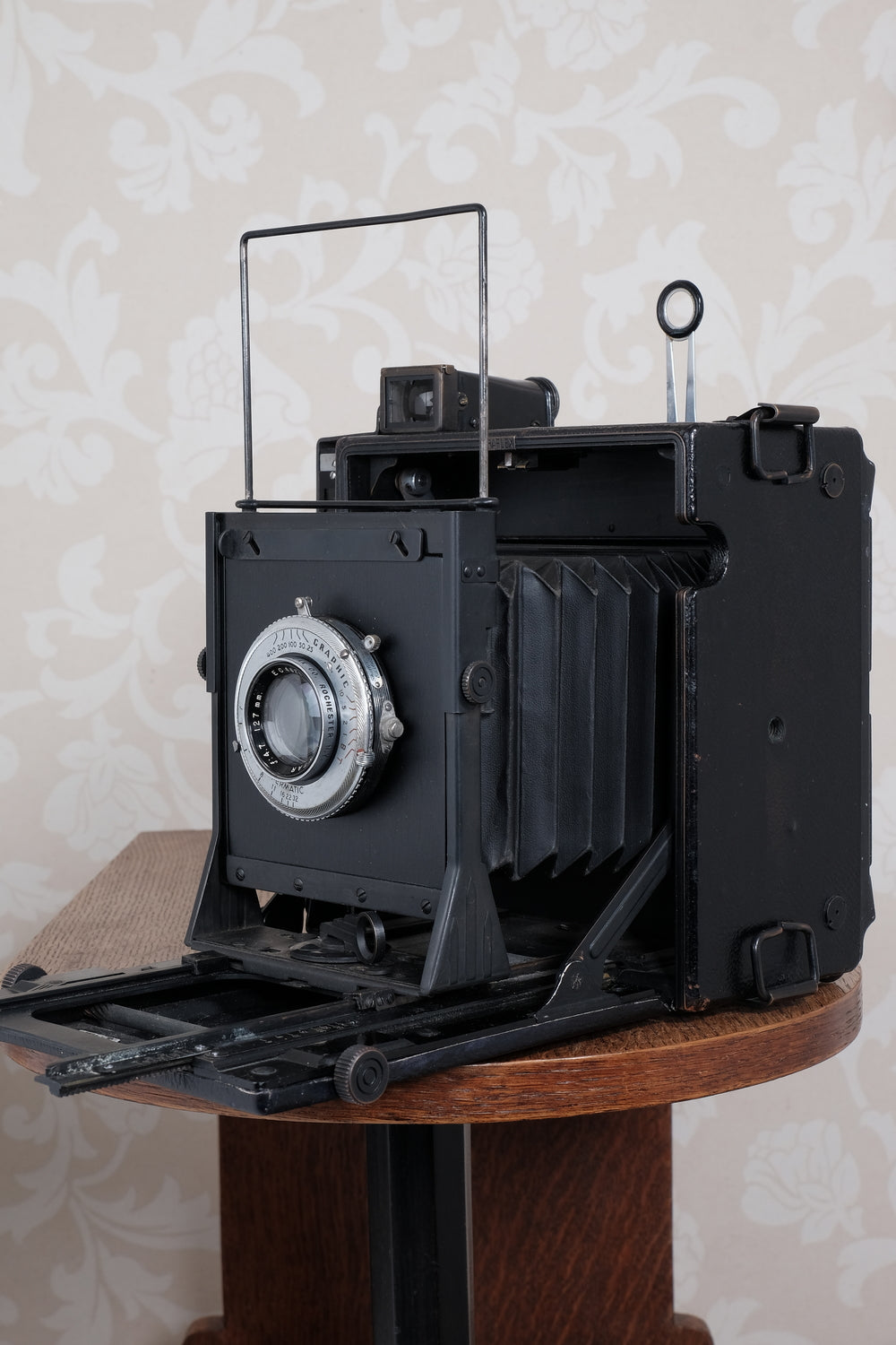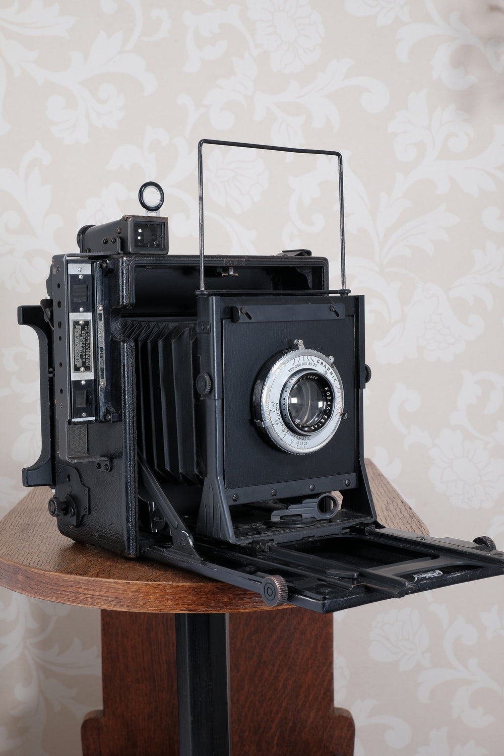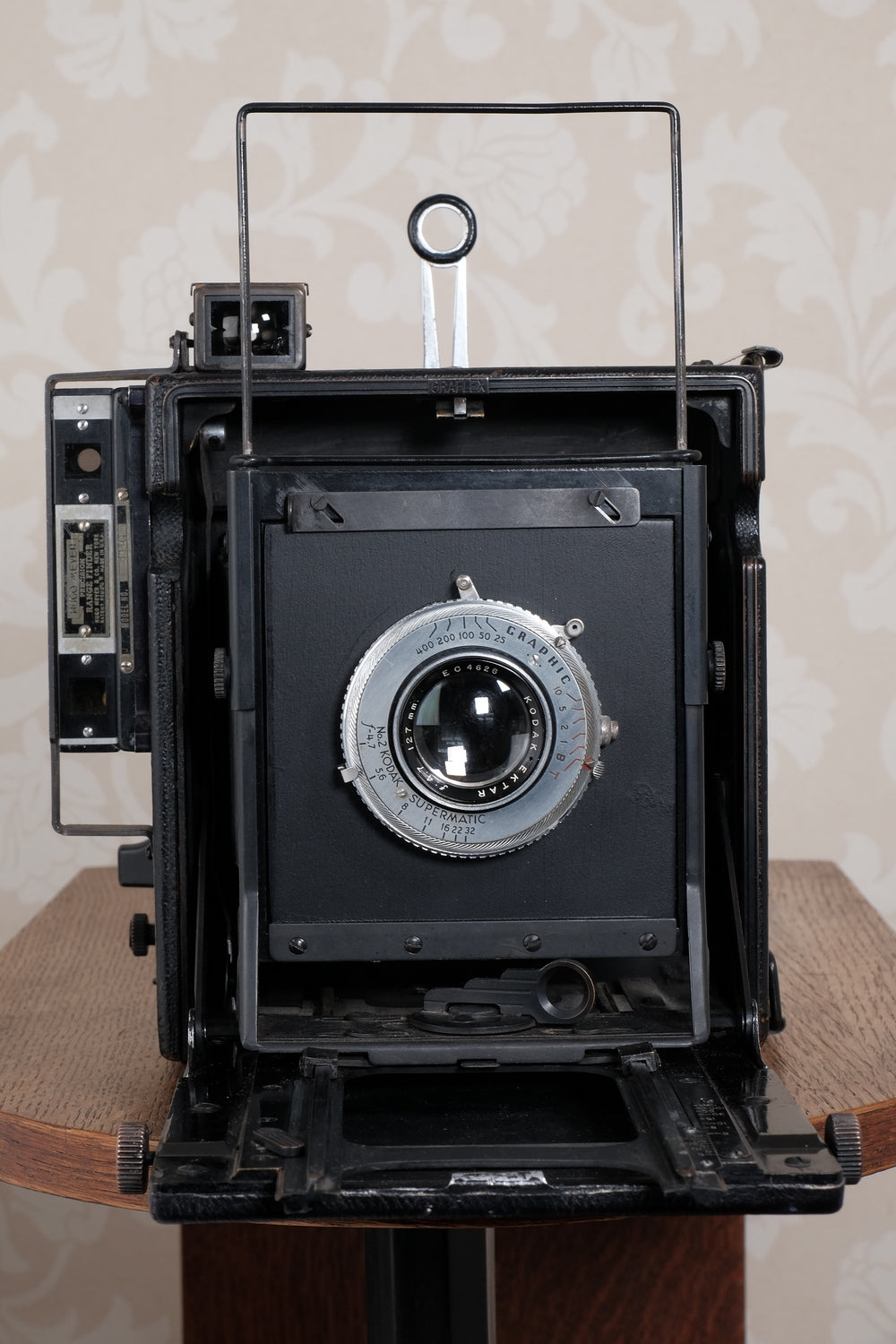 This camera is fitted with a top-of-the-line f4.7/127mm Kodak Ektar lens and a Kodak Supermatic shutter. The Supermatic shutter has been carefully cleaned, lubricated and adjusted. The shutter fires smoothly and all speeds are appropriate. The slow speeds buzz along smoothly and the fast ones are clean and snappy. The lens is exceptionally clean and clear. There are no scratches, just some light cleaning wisps and it’s capable of producing superb results with both color and black & white film.