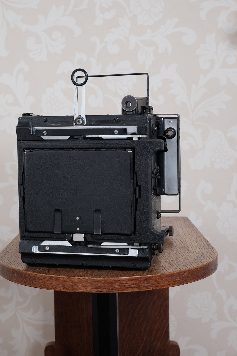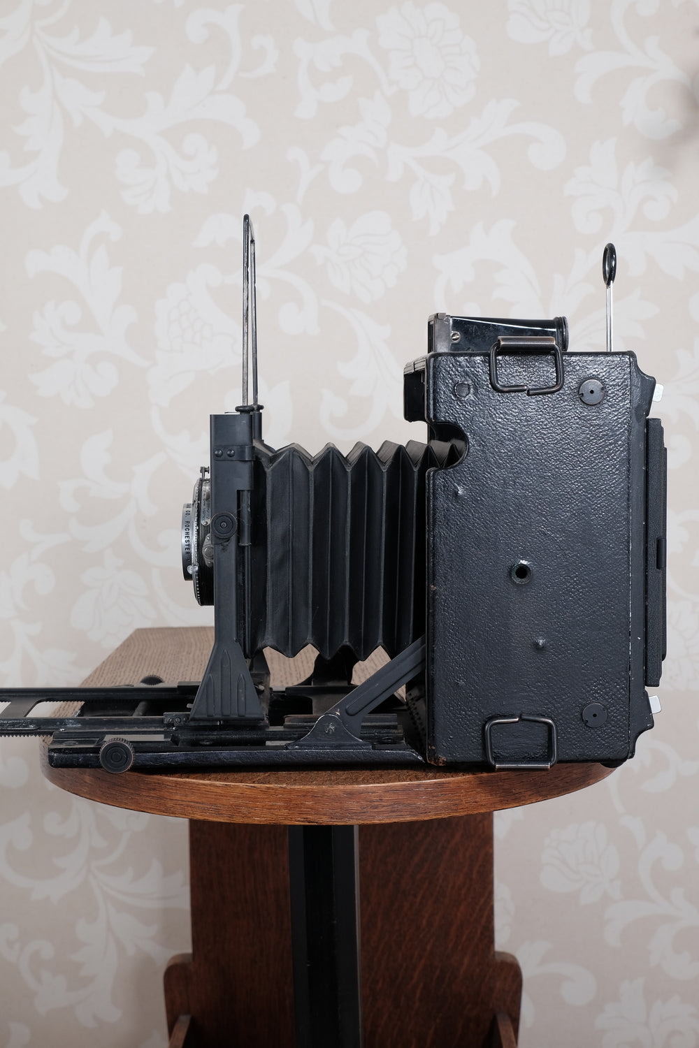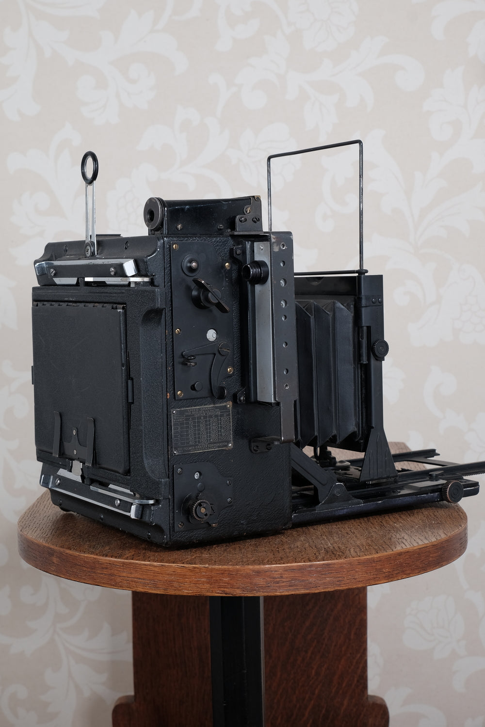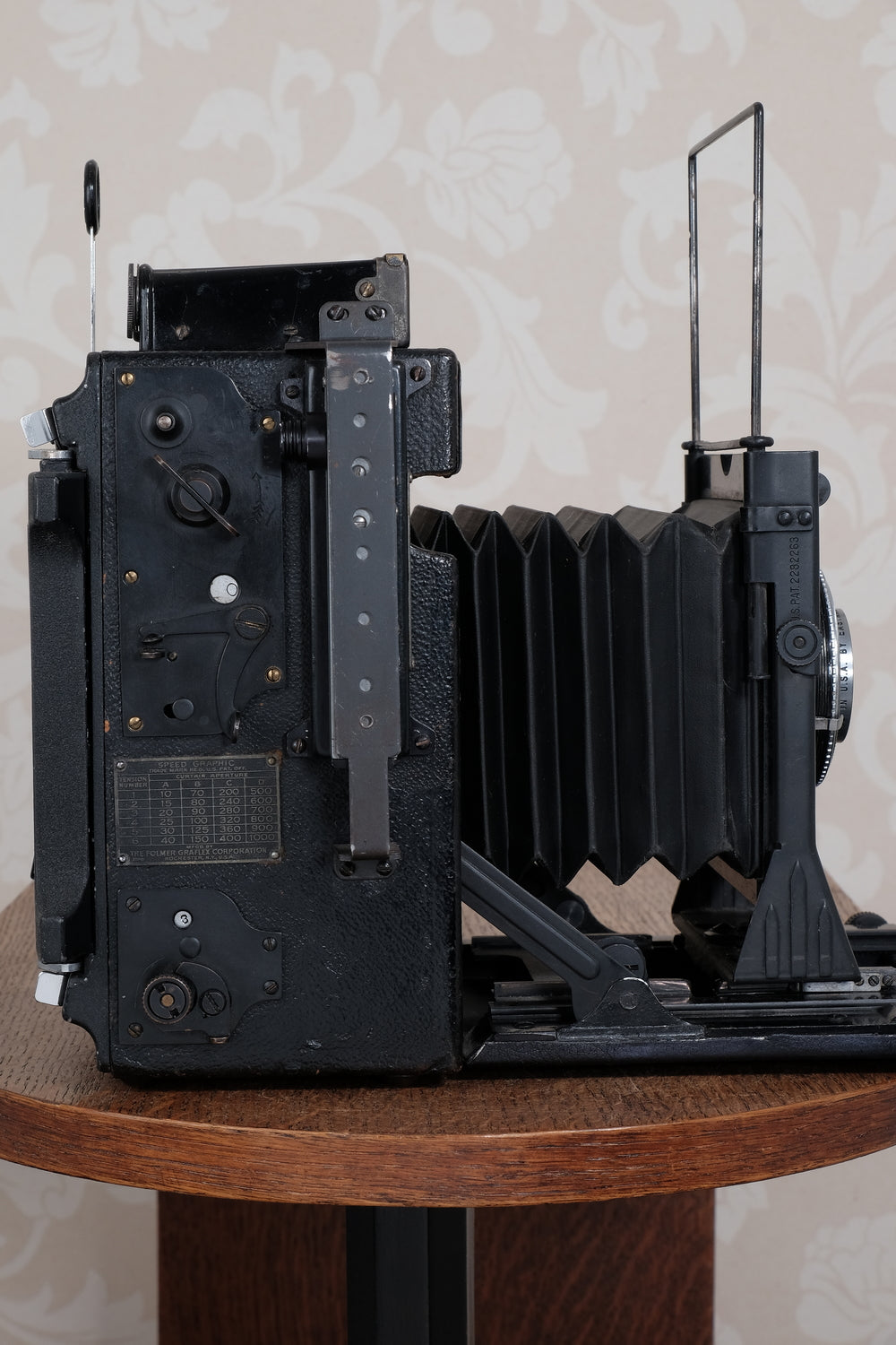 This Speed Graflex was an expensive model which featured a secondary focal plane shutter which permitted it to use lenses that didn't have a leaf shutter built into them. This gave the camera extra lens flexibility and currently makes it an excellent candidate for photographers who want to use big, fast Aero-Ektar lenses. The focal plane shutter on this camera still winds and releases smoothly. The shutter cloth is creased, as is the case with 90% of these cameras, but it's still light tight and appears to be usable. However because I’ve never used it I can’t vouch for its accuracy.