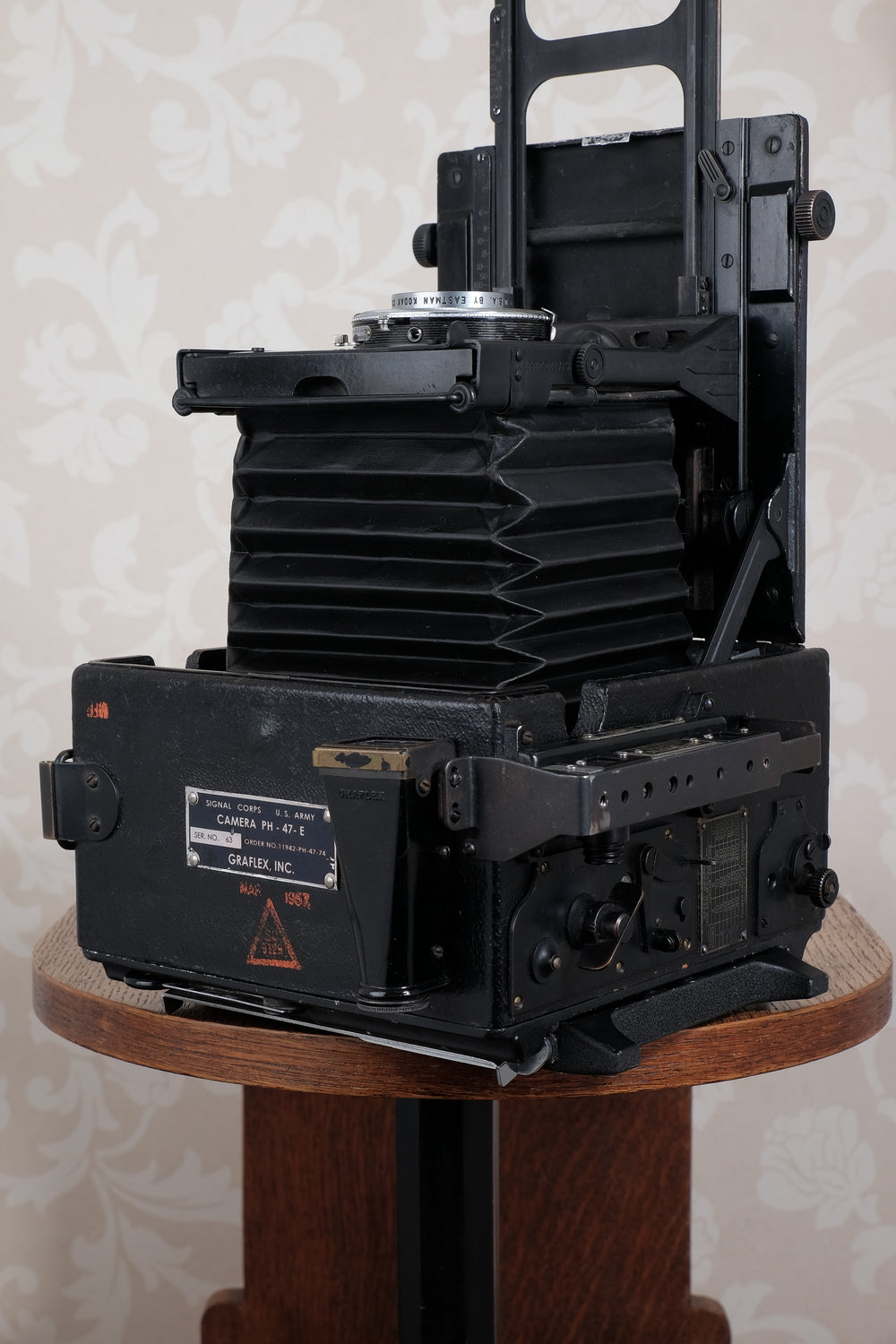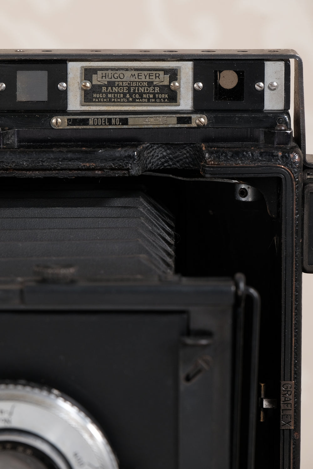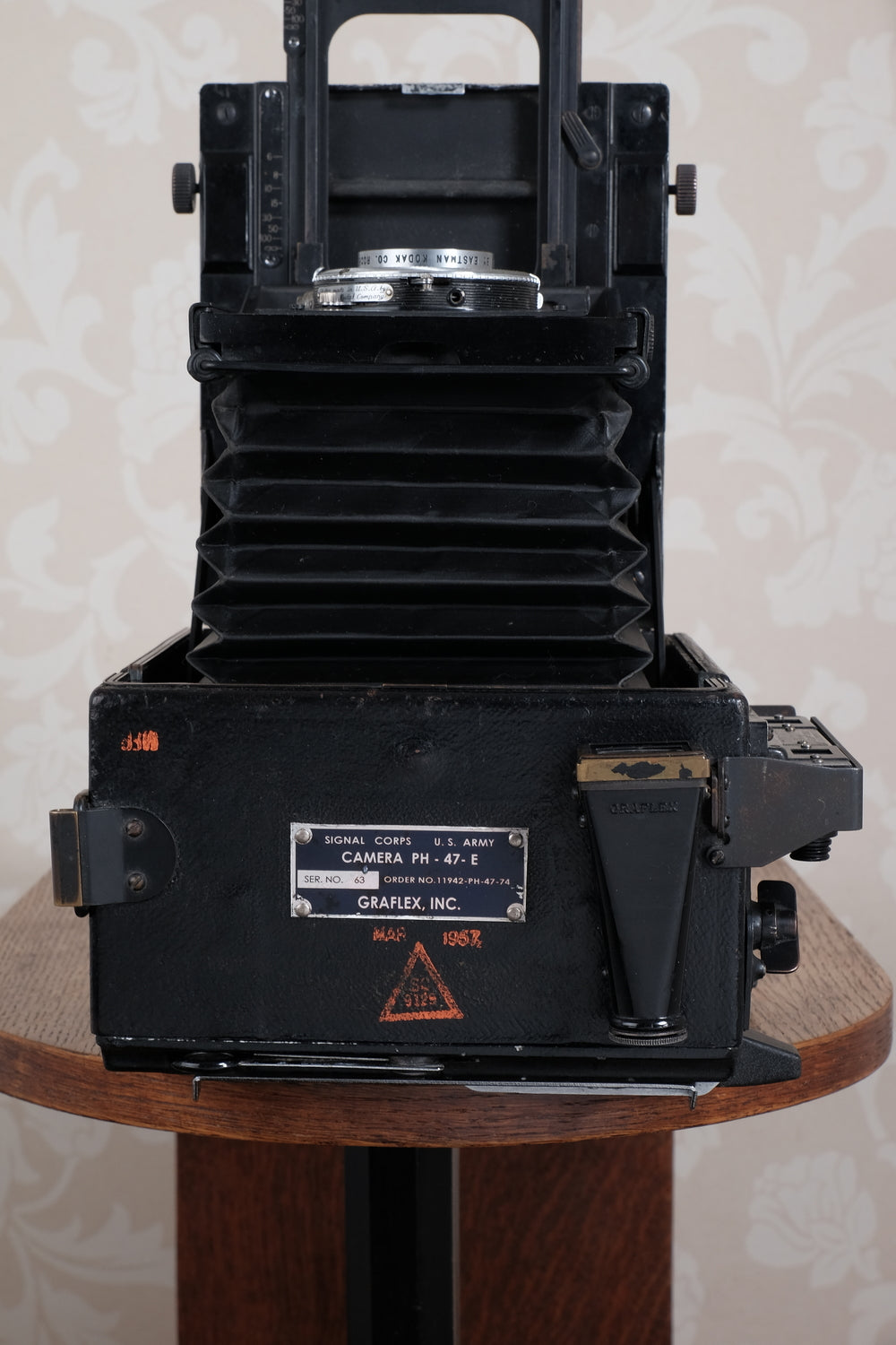 This desirable wartime Graflex camera comes from my personal collection. I purchased it many years ago in Germany and I believe that it arrived with US forces and remained behind after the hostilities in the European Theater ended. The folding struts, fittings and trim are all black in accordance with military specs. Remarkably it still retains the original military ID plate, which is unusual since they were often removed by photographers who weren't particularly interested in history. Sadly the same is true of countless wartime cameras, such as Leicas, which had their military markings crudely defaced.